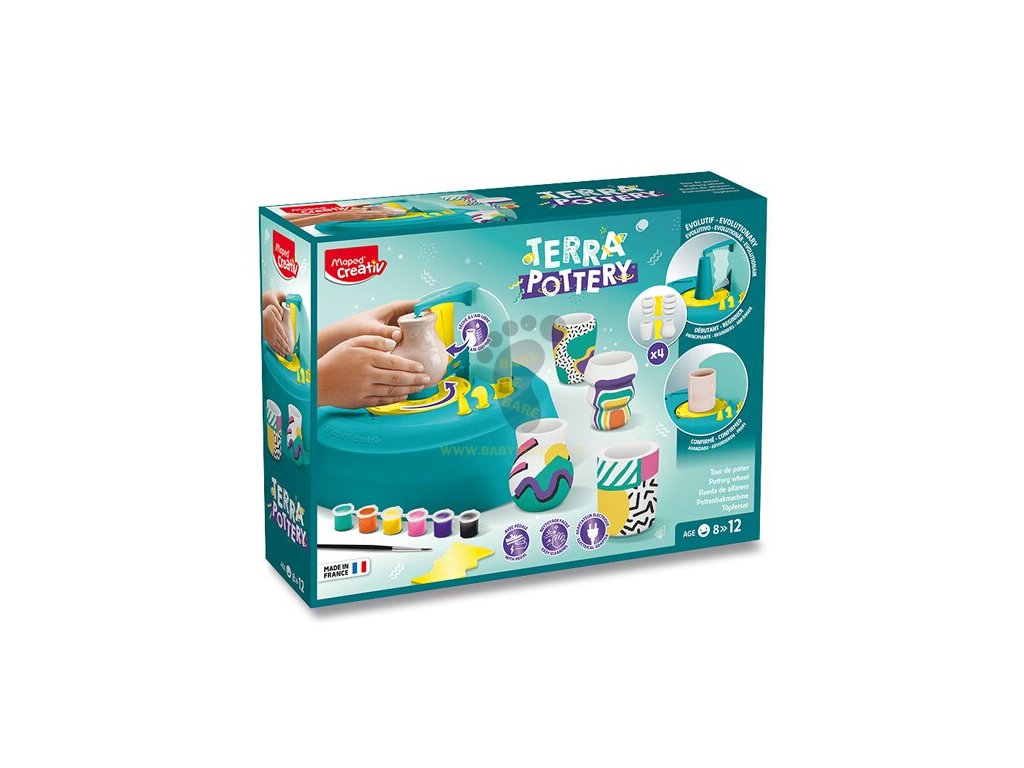 Kreativní keramická sada Terra Pottery obsahuje skutečný hrnčířský kruh s nožním pedálem k ovládání rychlosti otáčení a s výkonným motorem, který umožňuje vytvářet originální, jemně zdobenou keramiku bez vypalování. Možnost výběru ze dvou úrovní obtížnosti dle zručnosti dítěte - tj. tvorba se šablonou (4 tvary) nebo bez šablony. Ideální pro rozvoj dětské zručnosti a tvůrčích smyslů. Vhodné pro děti od 8 let.